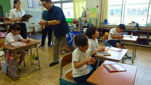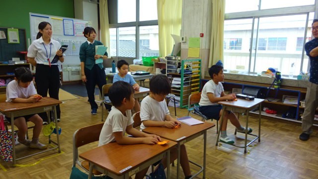 写真があまり上手でなく恐縮ですが、1枚目は折り紙を折っているところ、2枚目は色を塗っている様子です。今日は校内の教員も学習の様子を参観しました。