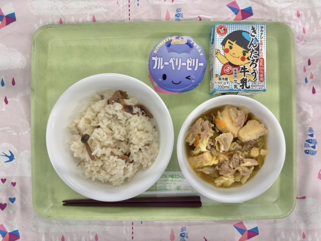 今日は前期の給食最終日です。そして明日10月10日は「目の愛護デー」。それにちなんで今日は目の愛護デー献立です。