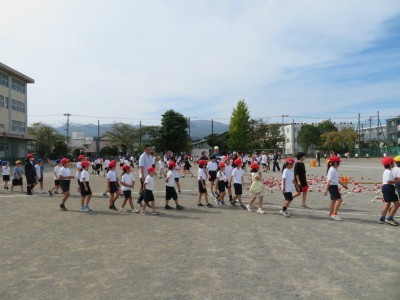 「玉入れ」に出場する子どもたちが運動場に集合し、入退場から練習していました。