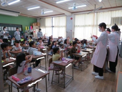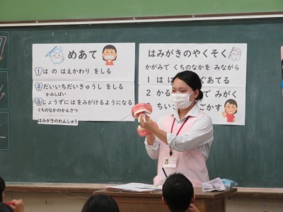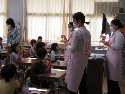 10月9日(木)に、神奈川歯科大学の学生さんたちが来校し、1年生に向けて上手な歯の磨き方を指導してくださいました。