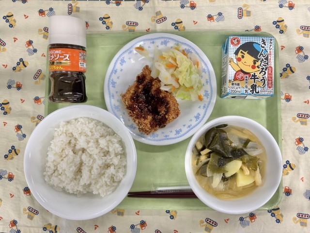 給食では験を担いで「とんかつ」の献立です。一枚一枚給食室でパン粉をつけて揚げました。