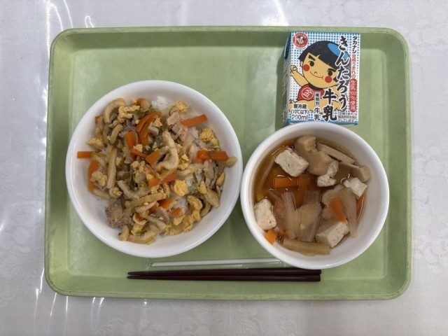 今日は油揚げとねぎを卵でとじた「衣笠丼」。給食では食中毒防止のため卵をしっかり加熱する必要があります。