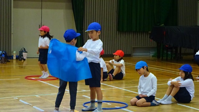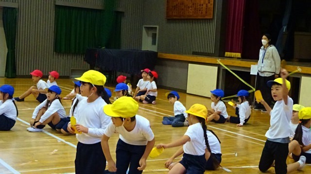 スポーツフェスティバルの1年生の学年種目は「おむすびころりん、さあいくぞ!」です。国語で学習した「おむすびころりん」の歌にあわせて競技が進みます。今日は雨が降ってしまったので、体育館で「おむすびころりん・・」の練習をしました。