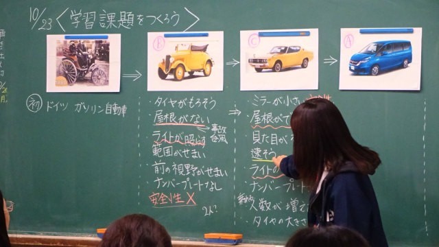 今日は、昔の車から今の車の写真から、変わっていることは何か確かめていました。いろいろな変化がありますが、子ども達の中からは、安全性が高まっている、という声が上がっていました。これから学習課題をつくり調べていきます。