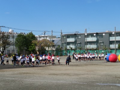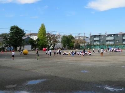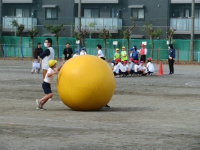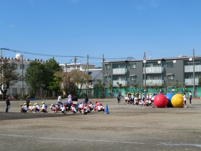 10月23日(木)の昼休みに実施された、スポーツフェスティバルに向けたなかよし班種目の大玉転がしの練習風景です。