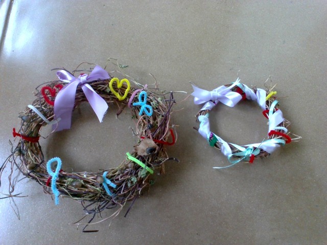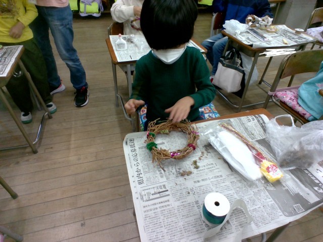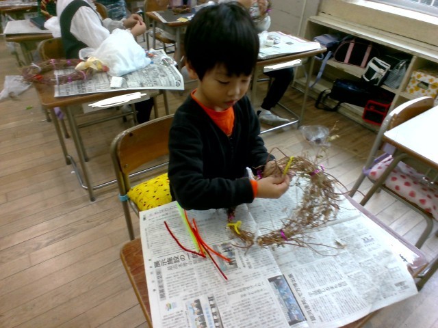 生活科の時間に「あさがおのリースづくり」をしました。モールやリボンを巻いたり、昨日校庭で採取したどんぐりや木の実をつけたりして、素敵なリースに仕上げることができました。