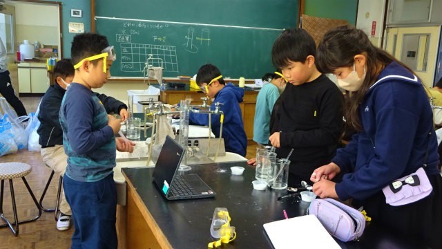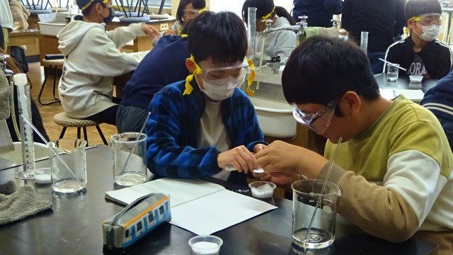 5年生は理科の学習で、物が水に溶ける量には限りがあるのかどうかを調べていました。食塩、砂糖、ミョウバンを一生懸命溶かしていました。さて結果はどうなったでしょうか?