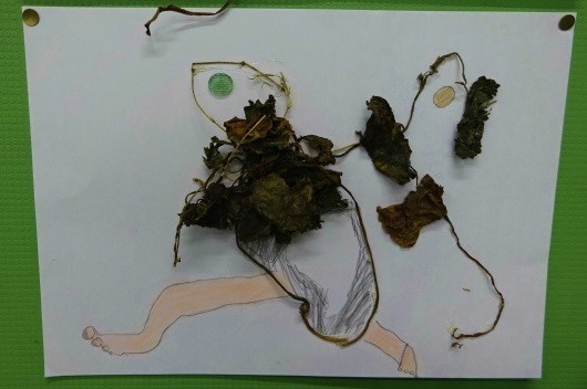 2枚目の写真は、さつまいもの葉を使って表現した絵です。ユニークな作品ですね。題名を聞いてみたいです。