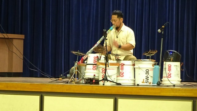 バケツ・ドラマーのMASAさんと一緒に!(校長室から)