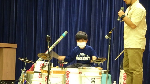 今年度は、バケツ・ドラマーのMASAさんが来校くださいました。ドラムになっているのは、ガソリンスタンドなどにある缶(オイルの缶なのでしょうか?)やガスの管などを使ったものだそうですが、とても響く、かっこいい音が出るのに驚きました。各学年の代表の子もドラムをたたかせていただきました。