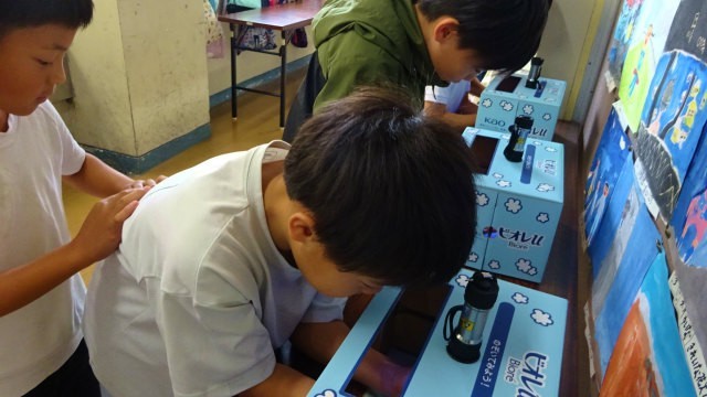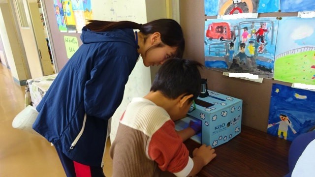 学習の後半では、手洗いがしっかりできているかどうか確認しました。手洗いチェック用のローションを手に付けて、いつも通りに手を洗います。(いつもよりかなり念入りだったようですが・・)そして、手洗いチェッカーに洗ったあとの手を入れて汚れが落ちているか確認します。チェッカーを覗くと、汚れが落ちていないところは青く光るようになっています。