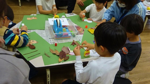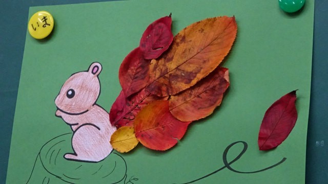 今日のわかあし図工では「りず」を作りました。りすのしっぽを落ち葉で表現します。赤や黄色の落ち葉の中から、好きなものを選んで画用紙に貼ります。