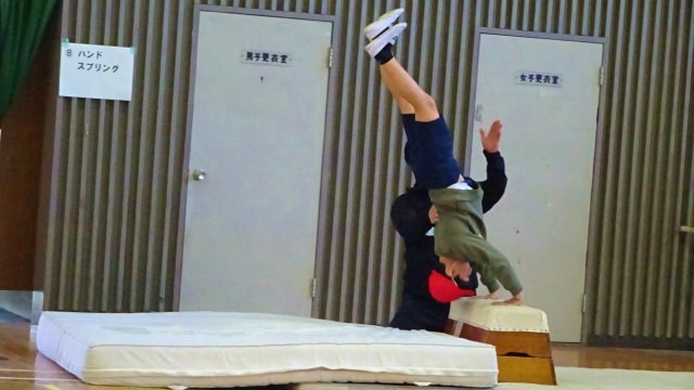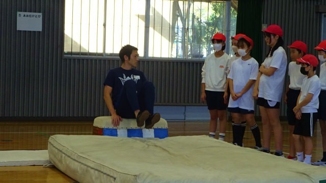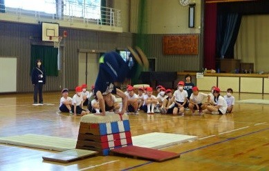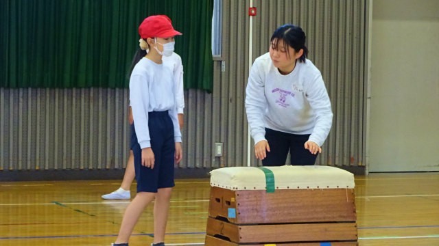 5年生は体育で跳び箱の練習をしています。今日は小田原市教育委員会から体力・運動能力向上指導員の皆さんを講師にお迎えし、新しい技を教わったり、今取り組んでいる技のコツを教わったりしました。指導員の皆さんは主に大学の体育学部の学生さんです。