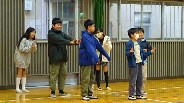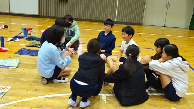 グループで協力して考え、練習したものを、やや恥ずかしそうではあるけれども、発表することができました。見ている子ども達は声援を送っていました。発表の後はグループでふり返りをしました。