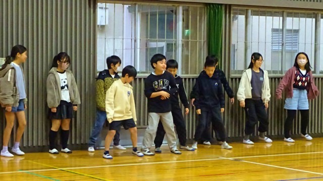 音楽タイムのあと、5年生は体育館で音楽の学習を続けていました。写真をうまく撮れずに恐縮なのですが、グループでリズムにあわせてステップを踏んだり、振りをつけたりしたものを、学年みんなの前で発表していました。
