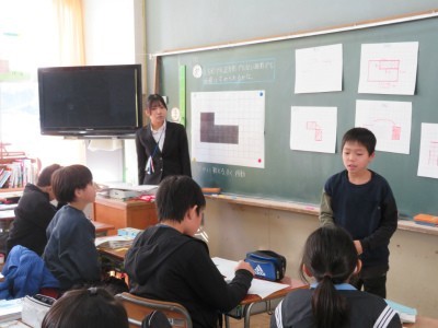 子どもたちが、「長方形でも正方形でもない図形でも面積は求められるかな。」というめあてをつくり、みんなで様々なやり方を考えていました。
