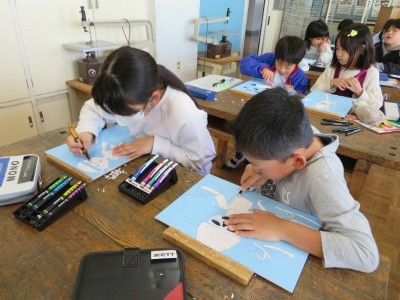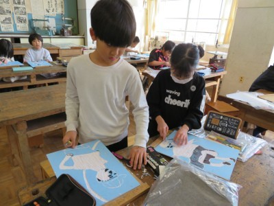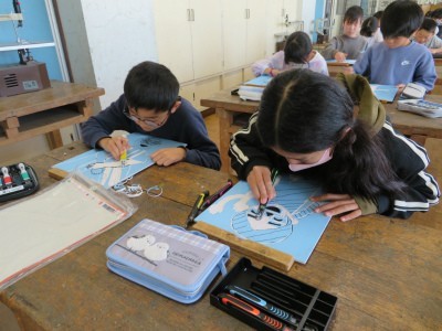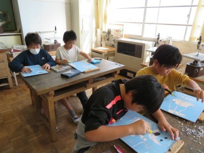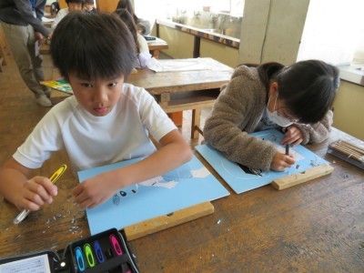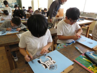 初めて取り組む木版画なので、これまで、どの子も十分に安全に気を付けながら掘り進めてきました。