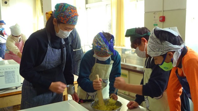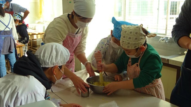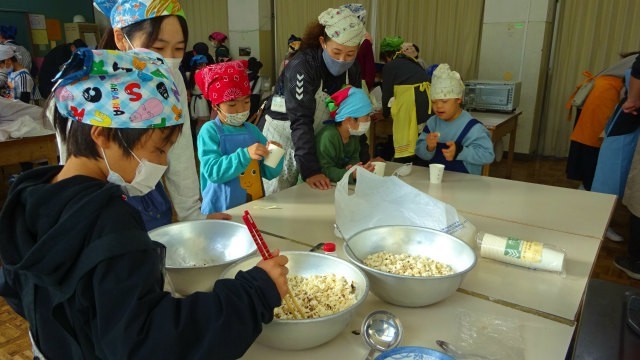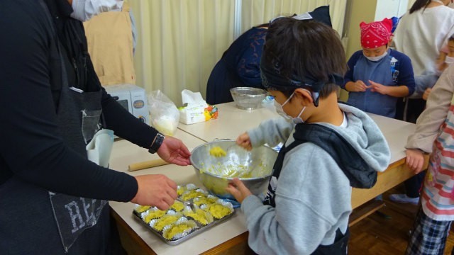 わかあし級では、畑で育てたさつまいもと、とうもろこし(ポップコーン用のとうもろこし)を使って、スイートポテトとポップコーンをつくりました。昨年はさつまいもを蒸しパンにしたのですが、今年度はスイートポテトでした。