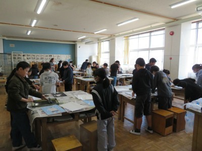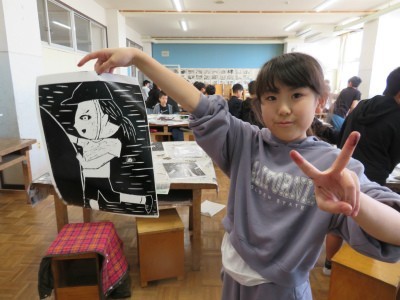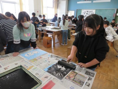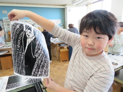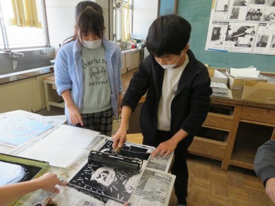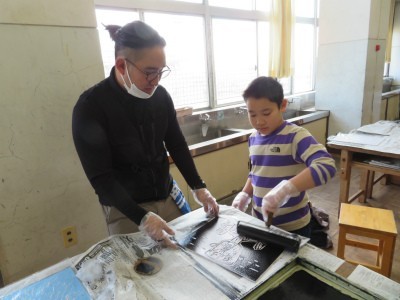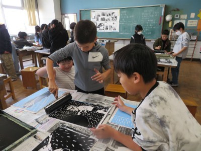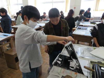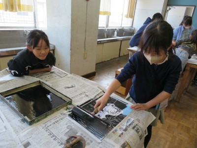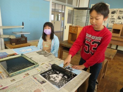 先日の4年1組に続いて、この日は4年2組が木版画の印刷をしました。