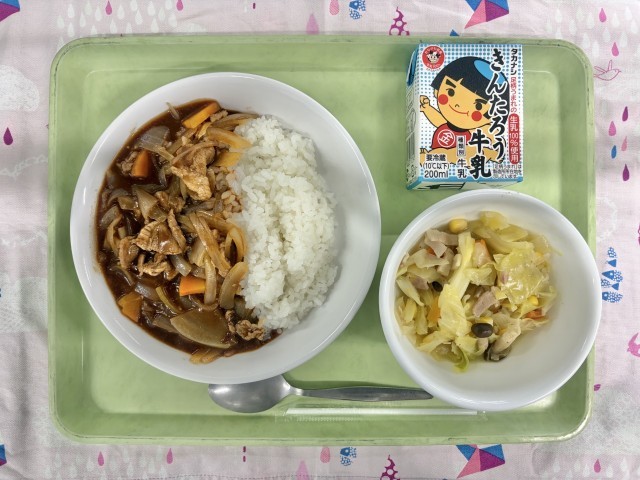 薄切りにした牛肉と玉ねぎをデミグラスソースで煮込む料理ですが、給食では衛生の関係上牛肉が使えないため、豚肉のハヤシライスです。