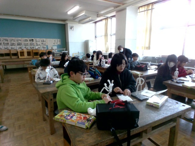 今回は1組の図工の様子です。体の厚みや指の太さ、関節などを意識しながら人間らしい形になるように頑張っています。躍動感のある瞬間を形にしようとしている子が多いです。