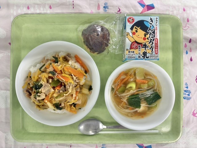 今日は子ども達が大好きなキムチを使った豚キムチ丼の献立です。