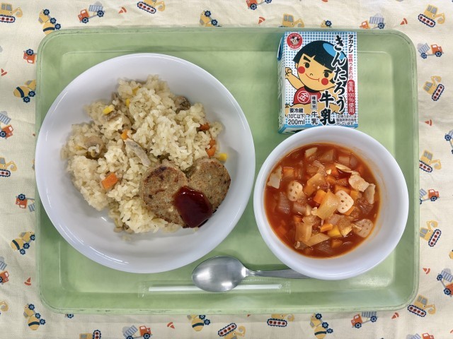 給食室で炊き上げたピラフと一緒に、今日もたくさん食べてもらえたら嬉しいです。