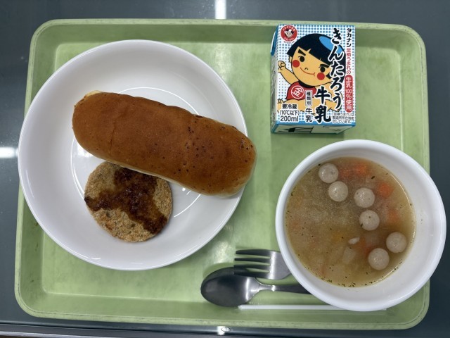 今日はメンチカツとマセドニアンスープ、パンはダイスチーズの入ったチーズパンの献立です。