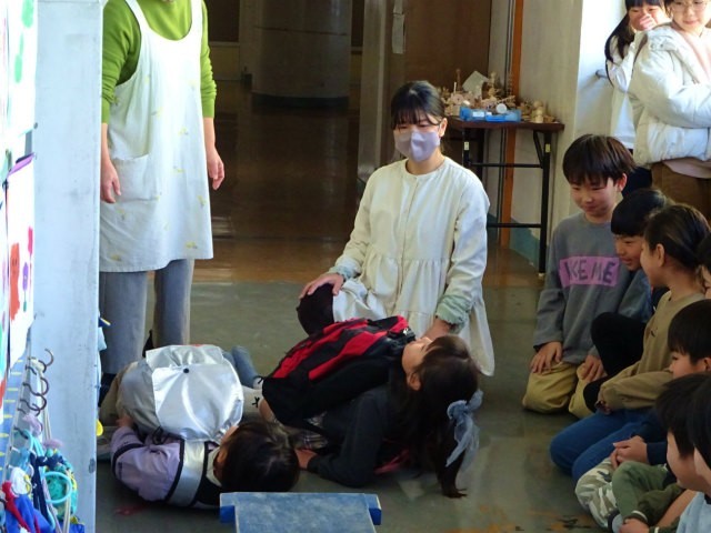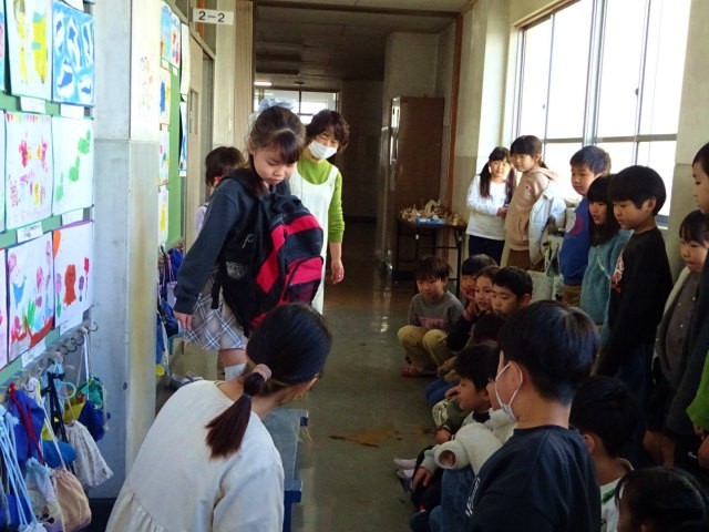 いのちのはじまりは、画用紙に針で穴を開けたときにできた穴ぐらいの大きさだったこと、それがだんだんりんごぐらいになって・・と次第に大きくなっていくことなどの話も、養護教諭から聞きました。クラスの代表の児童が、赤ちゃんの重さぐらいのナップザックをお腹につけて、横になったり立ち上がったり、台に乗ってみたりなど、疑似妊婦さんの経験をしてみました。