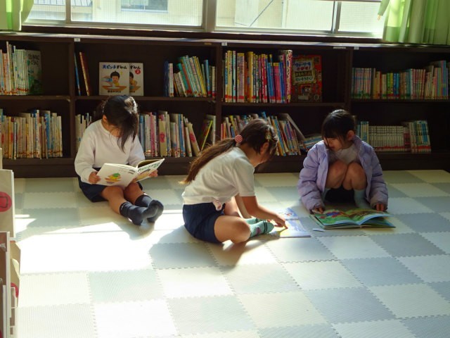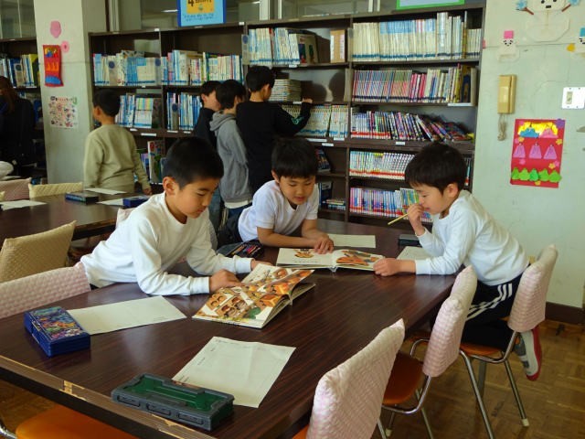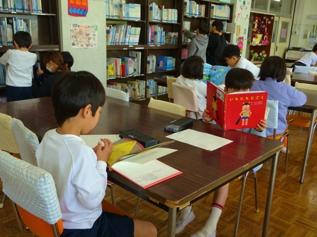 1年生が国語の学習で図書室に来ていました。お話の本を探して読んでみて、あらすじなどを書くようです。みんな思い思いに本を選んで、友達と一緒に読んだり、一人で読んだりしていました。図書室にはいろいろな本がありますので、たくさんの本に触れてみてほしいです。