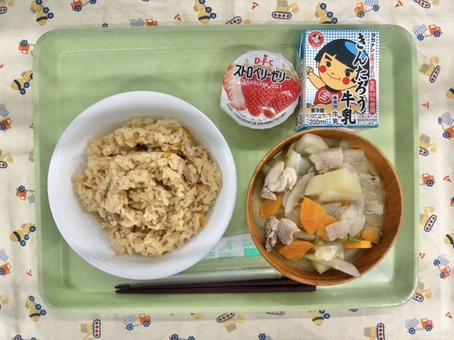 基本的に普段の白いご飯は、委託米飯で専門の業者さんが当日の朝炊飯したものをクラスごとの保温箱に入れて運んできてくださいますが、今日のように給食室で炊き込む味付きごはんも登場します。