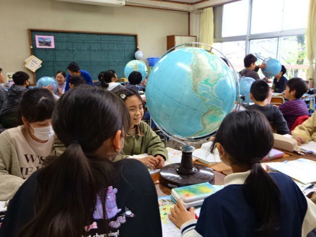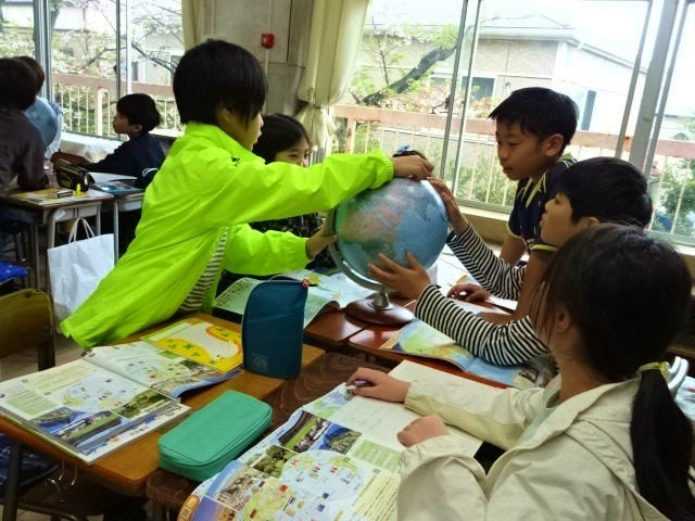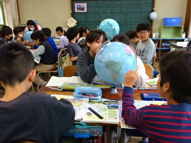 5年生の社会科はさらに範囲が広くなって、地球儀をながめて、どの国に行ってみたいか話し合っていました。日本を出発してまた日本に帰ってくるというツアーをグループで考えていました。5年生の社会科では日本の農業や漁業、工業などの産業について学習していきますが、そうした日本の産業が、広い世界とどうつながっているのかを学ぶことになります。つながりの中に日本があります。ワールドツアーにようこそ。出発です。