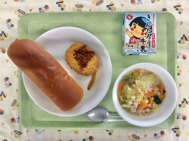 おかずがかぼちゃの入ったコロッケと、芦子小学校の人気メニュー、「ABCスープ」です。