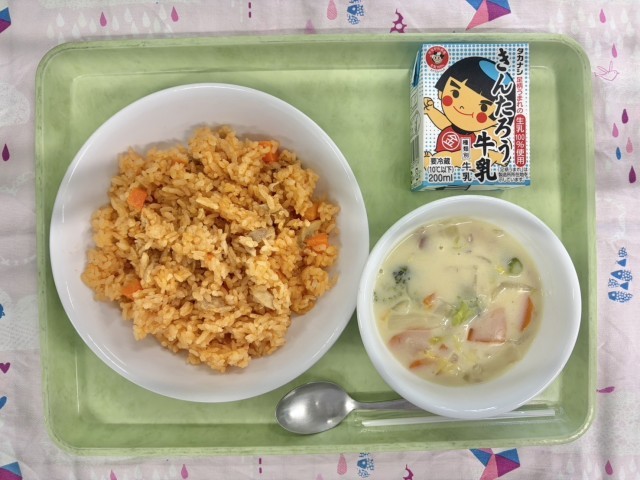 今日の給食は給食室で炊き込んだチキンライスと、春キャベツや新玉ねぎなど季節の野菜をたっぷり使ったシチューの献立です。