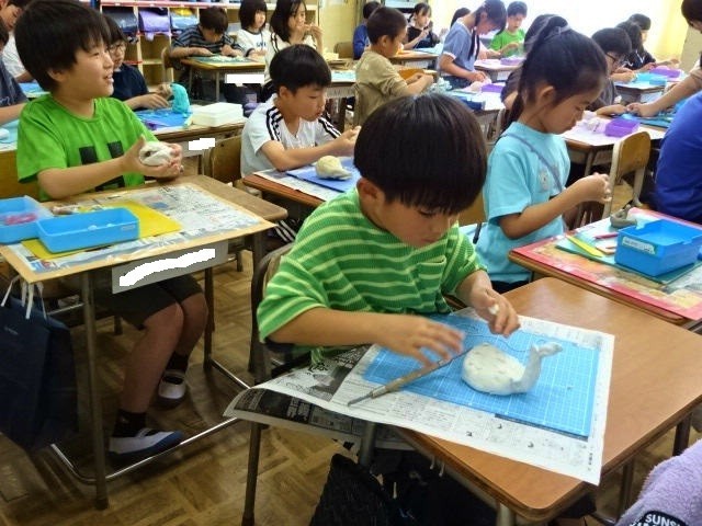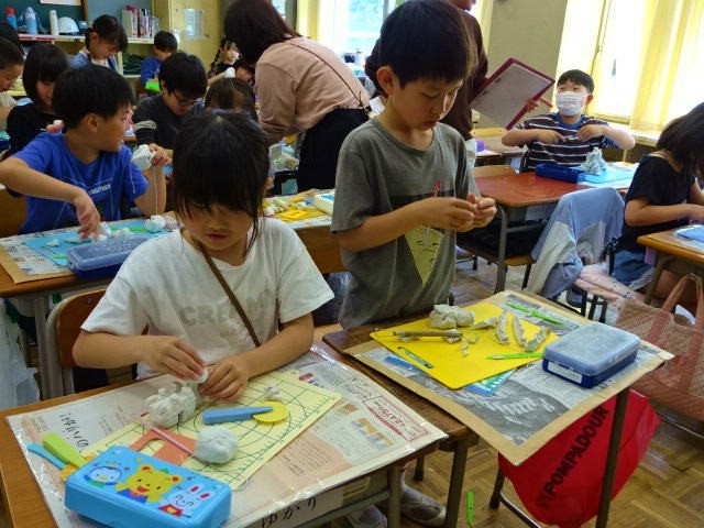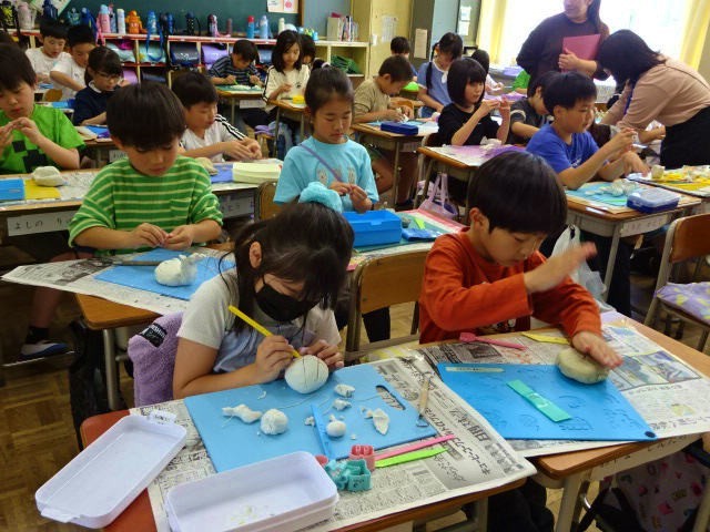3年生の図工の学習の様子です。3年生もねん土を使っていました。2年生は手で握って形をつくっていましたが、3年生では、糸やへらを使って、自分が表現したいものを形づくっていました。この学習をとおして糸やへらを適切に使えるように学習します。手の感触を楽しみながらつくる2年生と道具の使い方も学びながらの3年生です。それぞれどんな形の作品ができあがるのか興味深いです。