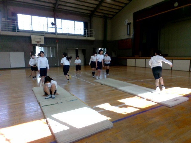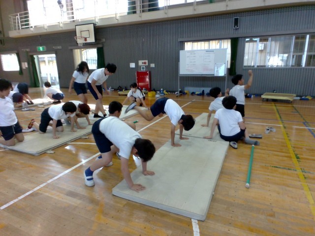 元気よく準備体操をした後、前転・後転などの技に挑戦しました。