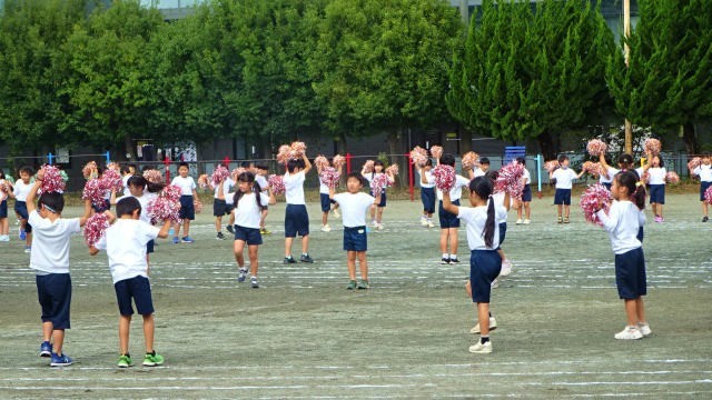 1・2年生は本番に使うポンポンをもって、表現の練習をしていました。踊りはもちろんのこと、隊形移動も上手にできていました。運動場で理科の学習をしていた上級生も、拍手を送っていました。本番を楽しみにしています!