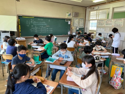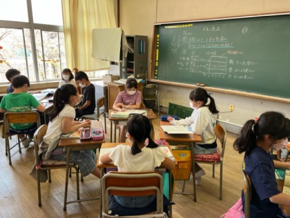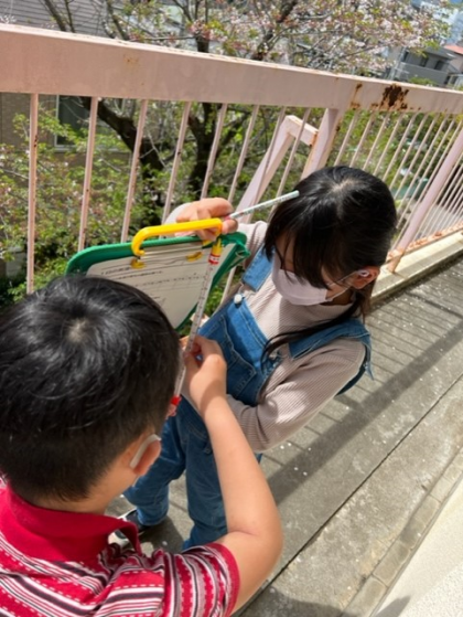 1日の気温の変化について、学習しています。子どもたちは、グループごとに観察の計画を立てています。今日は、ベランダやグラウンドで温度計を使って観察をしました。