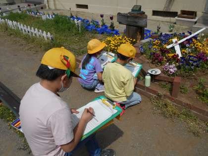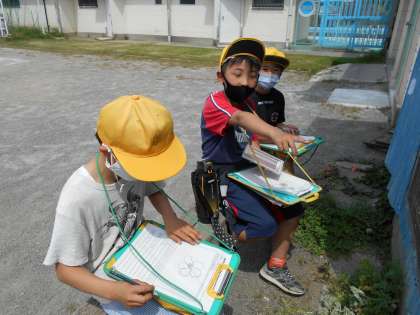 理科の「しぜんのかんさつ」で、校庭や中庭に春を探しに行きました。虫や花などの大きさを自分と比べてみたり花びらの数に注目したりして熱心に観察する様子がありました。