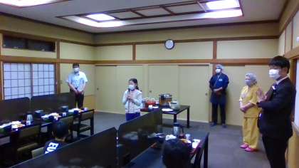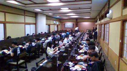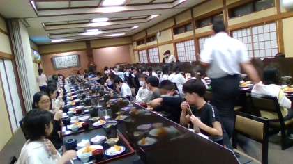 いよいよ夕食の時間になりました。少し早いお昼だったこともあり、お腹が空いている子どもたち!パーテーションで仕切られ、感染予防対策もきちんとなされています。