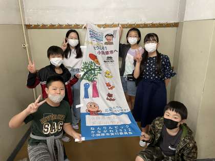 子どもたちが作ったねんりんピックの応援旗です。上手にできて、満足そうな表情が印象的です。