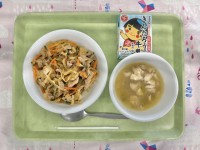 「たぬき汁」は、一体どんな汁かな?と考えていたら、具がたっぷり入ったみそ汁でした。たぬき汁の名前の由来には、「こんにゃくを使った汁」とか「たぬきが化けた」など、さまざまな説があるそうです。具だくさんのあたたかい汁で、体もあたたまりますね。