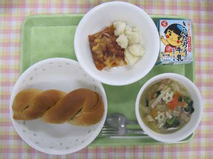 今日のスープに入っているマカロニは、「米粉マカロニ」です。(スープの中に白い星型のものが見えますね。)小麦粉から作られるマカロニに比べて、柔らかくて白っぽいです。癖のない味なので、野菜のうま味が溶け込んだ今日のスープにもぴったりです。