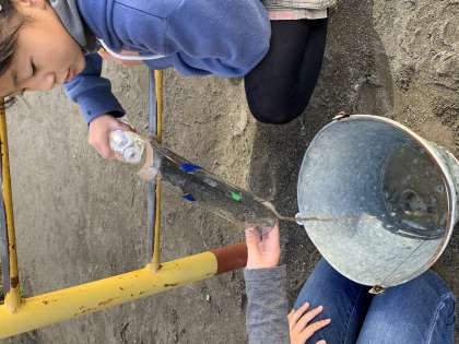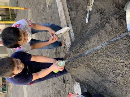 今5年生の理科では「流れる水のはたらき」の学習をしています。写真は、雨の日に川の水がにごる理由を調べるための実験方法を自分たちで考えて実験している様子です。