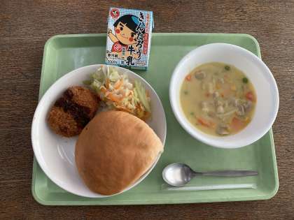 今日は自分でコロッケをパンにはさんで食べるセルフミートコロッケバーガーと、コーンを中心にたくさんの野菜が入った子どもたちの大好きなシチューです。今日のシチューには豆乳が使われています。豆乳の中に含まれている「レシチン・コリン」には、記憶力や集中力を高め、物忘れをなくす効果があると言われています。豆乳というと少しくせのあるイメージもありますが、子どもたちが残さず美味しく食べられたのは、調理員さんや栄養士の先生の努力のおかげです。ありがとうございました。