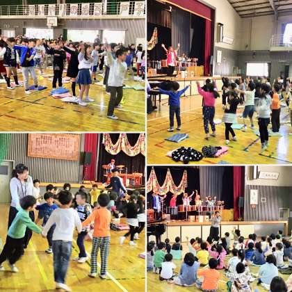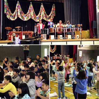 今日は芸術鑑賞会今年は世界の打楽器リズムコンサートです。まず、下学年が鑑賞しました。