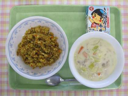 今日のカレーピラフは、「アルファ化米」を使って給食室で調理員さんが炊き込んで作ってくださいました。アルファ化米は、近年登山用や緊急時の非常食として普及してきています。炊きあがったごはんを急速に乾燥させたアルファ化米は、水やお湯を注ぐだけでもとの水分を含んだごはんに戻ります。今日は細かく刻んだ具といっしょにカレーピラフに仕上がりました。