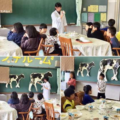 まず栄養士の神代先生から牛乳についてお話がありました。牛の赤ちゃんはお乳(牛乳)を飲むだけで大きくなることに気づいた子どもたちは、びっくり。毎日の給食に牛乳が出るわけがわかったようです。