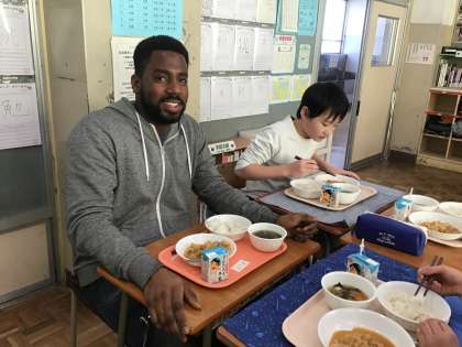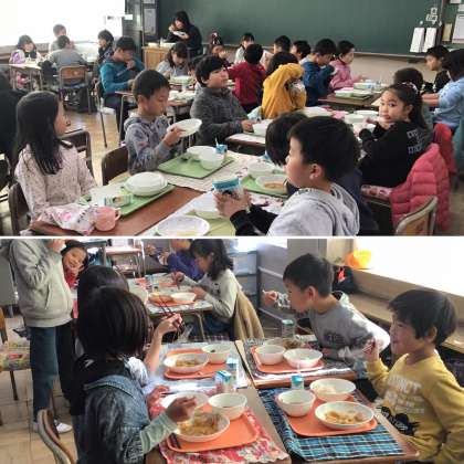 ALTのタージュ先生も6年生も2年生も、みんなおいしそうに食べていました。