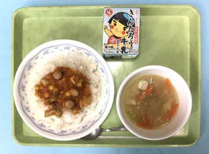 今日は、前期最後の給食です。ごはんの上に具が載っているので、自分で混ぜてチキンライスを完成させてください。スープには、ハート型のマカロニが入っています。スープの中から見つけてください。もしかしたら下の方に集まっているかも。